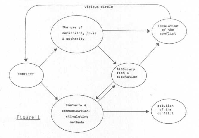 These methods that stimulate this contact and this communication bring conflicts to a solution. And this is even valid when some force has been used to archive a calm in the situation and to evoke communication. The connection I just described emerged time and again in thousands of conflicts; see again figure 1.The use of constraint, power and authority will at most lead to temporary adaptation of behaviour and to angry partings, but more often to an escalation of the conflict. The use of contact-and communication stimulating methods leads to recovery, often ton an improvement, of the contact and to a solution of the conflict. And ultimately to a better group climate. §7.The developed method is called: The contact and confrontation model. And this model works: from all the journals and utterances of the child care workers of the eleven groups in the research the following can be verified: